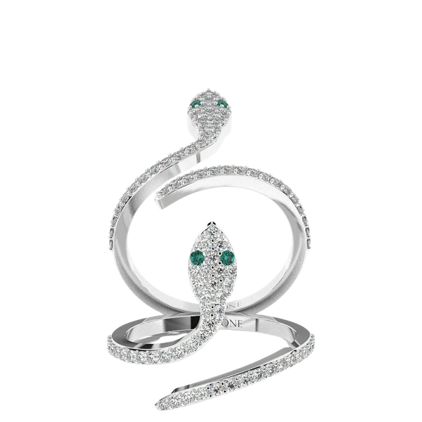 Indulge in the O'LEONE Serpent Ring – where the elegance of 18k gold meets the daring spirit of the serpent. Each diamond is carefully placed, a testament to enduring beauty and craftsmanship. The emerald eyes beckon a world of mystery and allure, a symbol of both wisdom and rebirth. This ring is an experience, an intimate secret shared between the piece and its wearer. Become part of the O'LEONE legacy – embrace the power, beauty, and finesse that this Serpent Ring embodies.